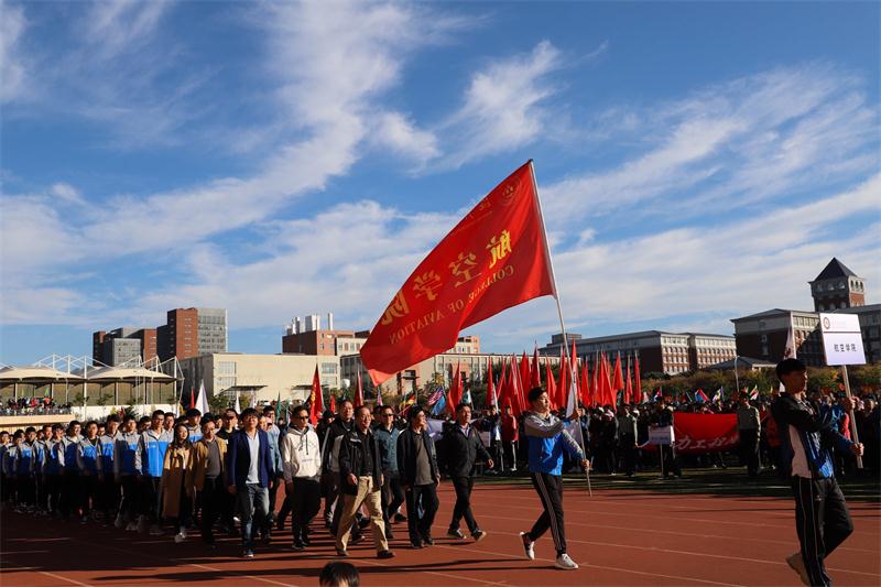 在运动会开幕式上,航空学院的老师、学生组成代表团,他们个个衣着整齐,面带笑容,迈着稳健的步伐走进开幕式现场,而现场观众席上欢呼声喝彩声也响彻校园上空。