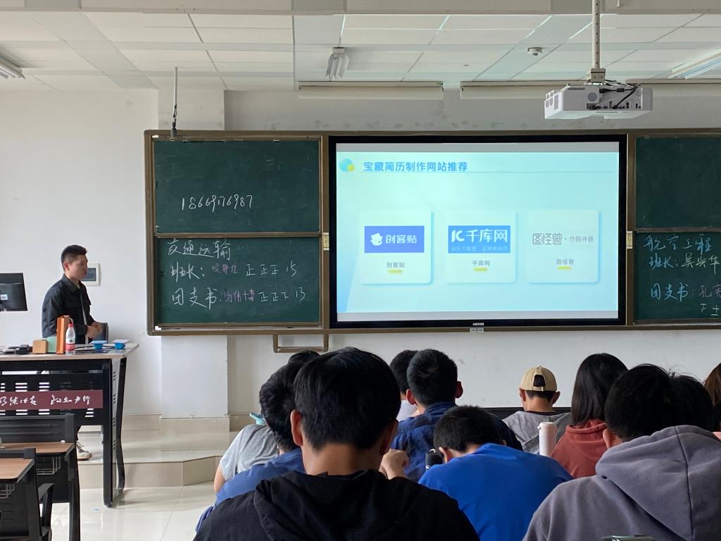 讲座开始,麻老师分享了个人简历制作的基本技巧,主要包括投递简历的最佳时间(工作日8:00-10:00)、简历模板的选择、个人信息的排版;其次,向学生提供了三个简历制作网站,分别是:创客贴、千库网、图怪兽;随后,向毕业生推荐了一些书籍,如《鱼没有脚》、《终身成长》等,用以提升学生对未来的信心,提高就业积极性;最后在答疑交流环节,针对“工作经验和较高的学历那个更为重要?”等问题,麻老师做出了专业的回答,引导学生从个人工作性质、工作需求等多方面思考问题,拓宽就业思维,鼓励同学找到合适的工作后,可以边工作边提升学历。