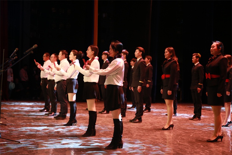晚会中,更有学院老师的倾情演唱。学院副院长朱兴东在现场欢呼声中深情演唱了《深秋的黎明》,教师代表与空乘2018级学生共唱《同一首歌》,获得现场经久不息的掌声。