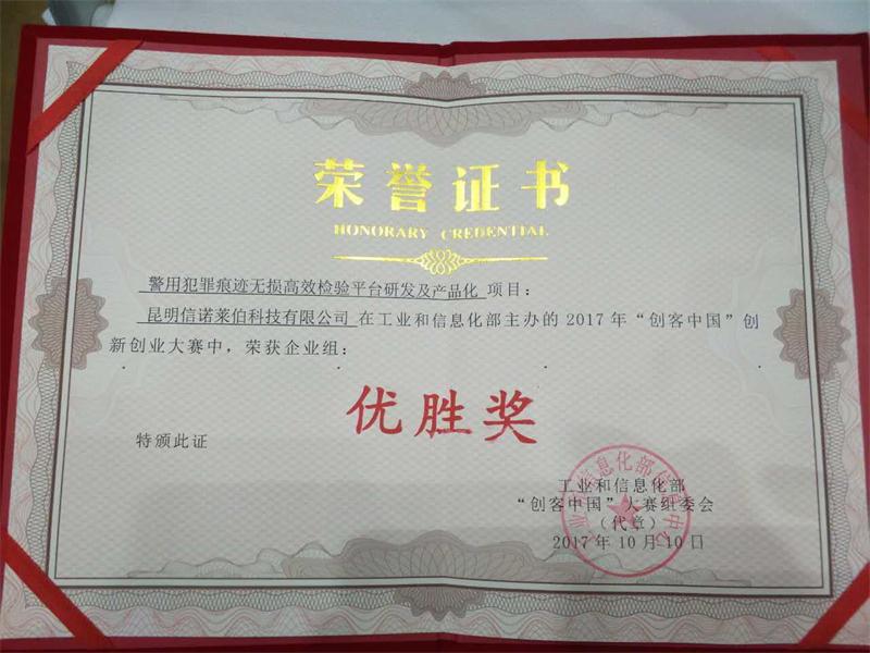 本次大赛经全国大赛组委会确认参赛项目为5275项。我校航空学院潘楠博士团队与国家高新技术企业昆明信诺莱伯科技有限公司共同承担的项目《警用犯罪痕迹无损高效检验平台研发及产品化》通过云南省50强、全国200强、全国24强三轮决选,获得企业组优胜奖(全国第10名,为云南省目前为止首次进入“创客中国”创新创业大赛全国总决赛并获奖的项目),代表性的展示了我院教师在科技创新、项目组织和产学研合作等方面综合能力。