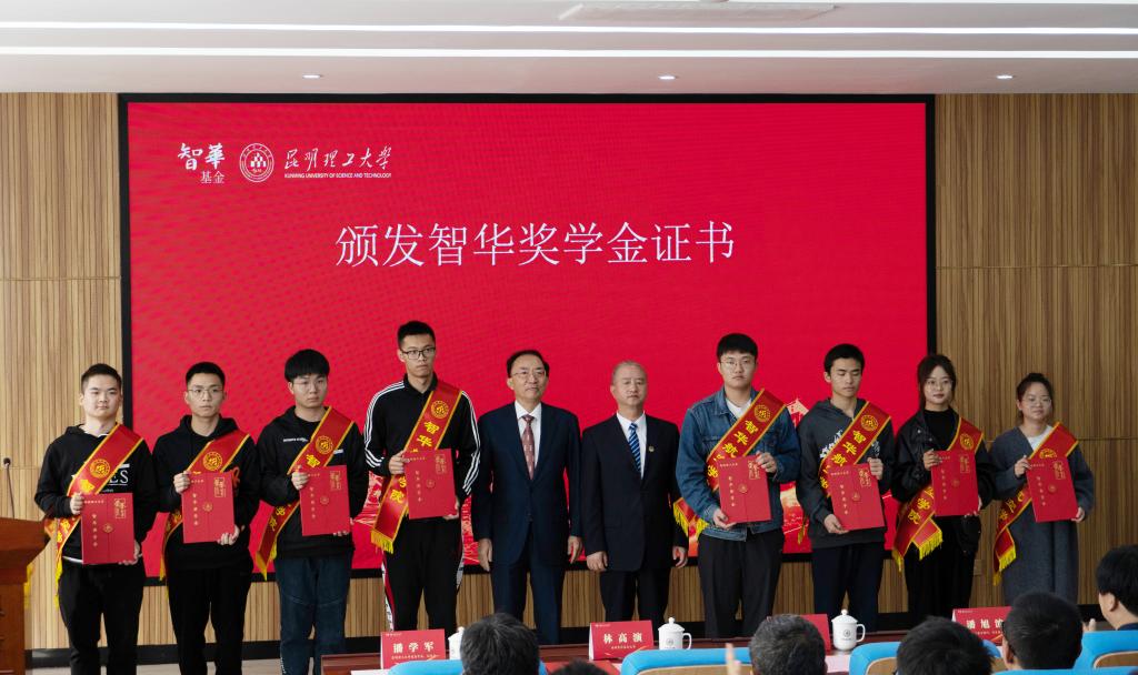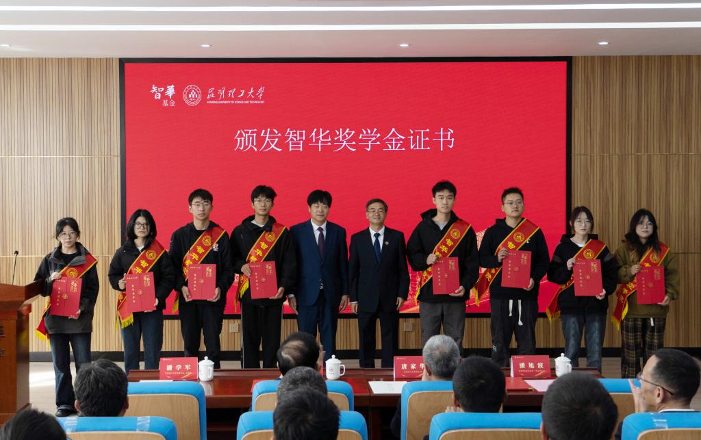 潘学军和潘旭波为获得智华新生奖学金的学生代表颁发奖学金证书。