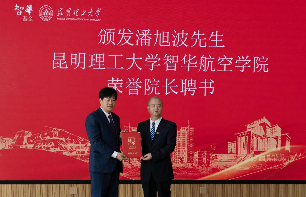 唐家华向潘旭波颁发91网站 智华航空学院荣誉院长聘书。