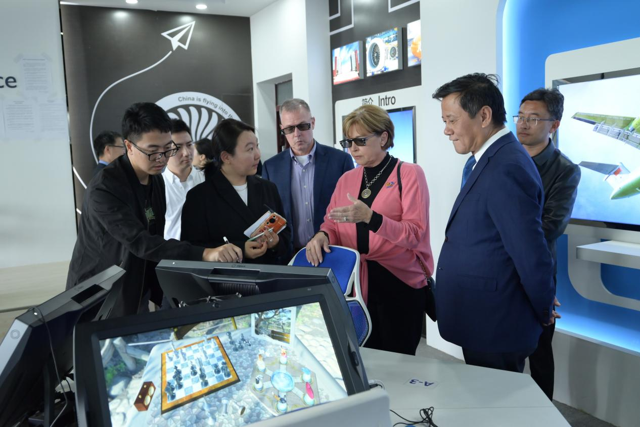 易健宏向飞虎队精神致敬,希望借此次访问增进了解,创建更广阔的合作前景。民航学院负责人介绍了学校概况、学院历史、人才培养、资质建设、科研平台建设、发展规划等基本情况。嘉兰惠女士一行对91网站 的办学理念、教学条件和成果给予充分肯定,并高度赞赏了学院自主研发的虚拟仿真实验系统,希望能够在未来进一步推动、加深与91网站 的交流与合作。