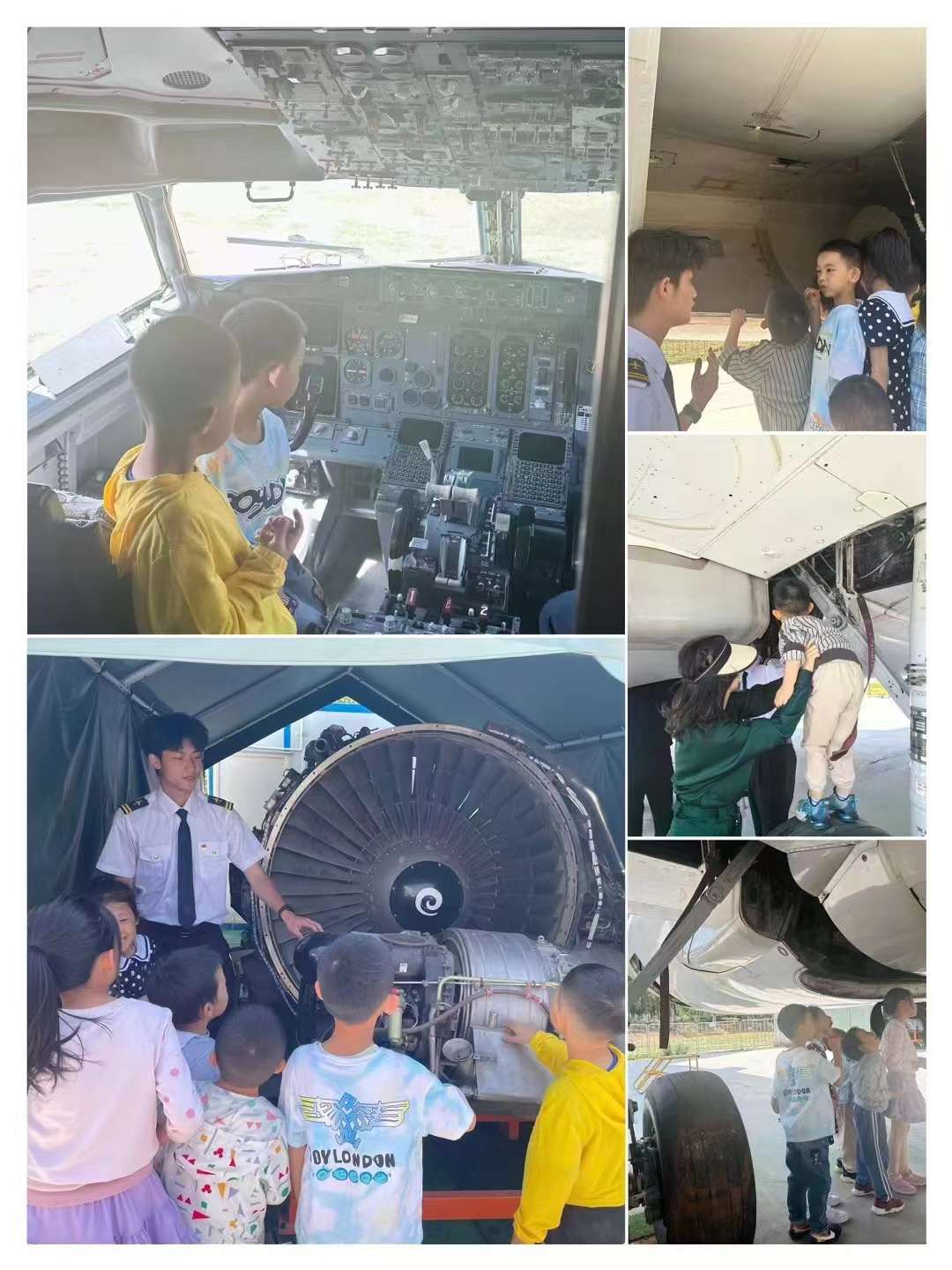 首先大家被一架真实的大飞机所吸引。飞行学生党员讲解了飞机机体各部分名称和功能,带领孩子们来到飞机驾驶舱,并演示了飞机启动、滑行、转向、起飞等操作。孩子们深深沉浸在飞行学生熟练的操作中,这一刻仿佛自己也成为了一名飞行员。