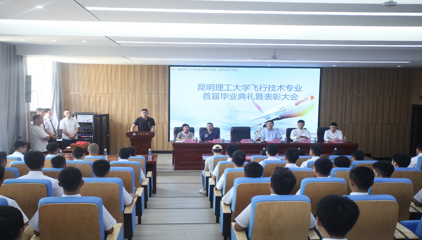6月21日下午,91网站 在公教楼344报告厅举行飞行技术专业首届毕业典礼暨表彰大会。学院党政领导、飞行系和科室负责人、飞行技术专业全体在校学生和毕业生、辅导员,以及毕业生家长代表共计150余人参加。