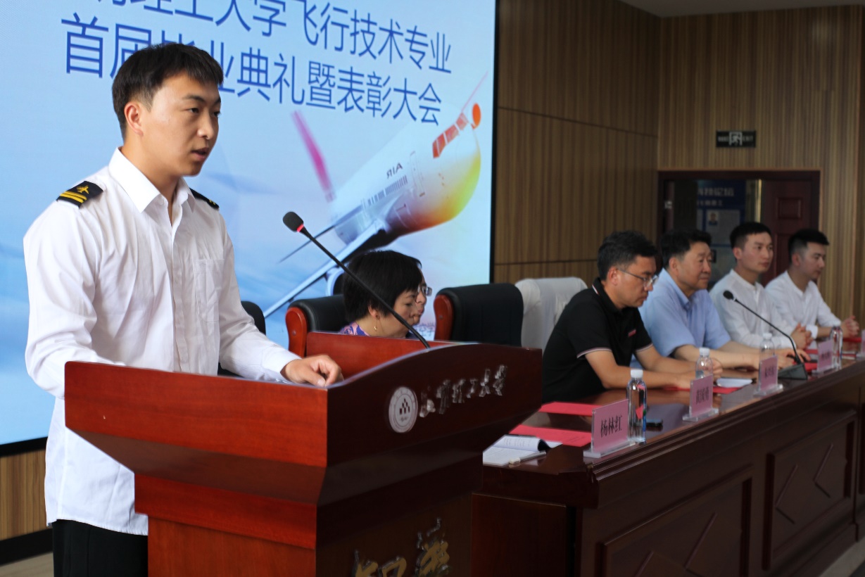 首先,学院党委书记朱兴东对12名飞行技术毕业生取得的优异成绩表示祝贺,朱兴东提到,“离别总是那么感伤,但我更希望与大家一同告别过去、拥抱未来,送你们重新出征、再次启程!愿大家在最美的青春年华,用最昂扬的高歌姿态,做最棒的航院青年,绽放最亮的光芒色彩!希望你们心怀家国,融入时代,做与国同行的奋进者;希望你们终身学习,敢于创新,做傲立潮头的引领者;希望你们坚韧不拔,保持从容,做脚踏实地的笃行者。前路漫漫,我看到大家脸上洋溢着自信与憧憬,也透露着一丝忐忑与担心,无论你们身在何处,航院永远是你们的坚强后盾和精神家园,母校的大门永远向你们敞开,无论飞多高、飞多远,欢迎大家常回家看看。最后祝诸君,鹏程万里,飞龙在天!”