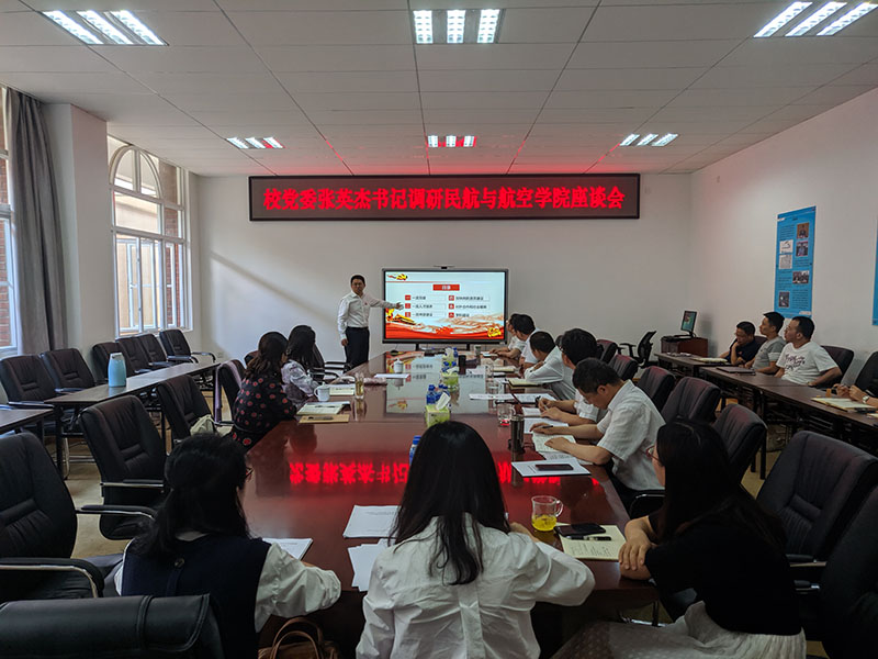 张英杰书记在认真听取了汇报后,首先充分肯定了学院在积极稳步推进改革过程中所取得的成绩,重点强调了学院办学过程中,要进一步强化党的领导,扎实推进党的建设各项工作,提高学院党委政治核心和党支部战斗堡垒作用;学院专业建设方面要紧密结合民航业发展需求,进一步明晰学院发展定位和思路,变成特色、办出亮点;民航人才培养方面要进一步加强思想政治教育,全面落实立德树人根本任务。张书记还针对学院在人才培养、学科方向凝练、资质建设申请、科研团队建设等有关问题进行了具体的指导。