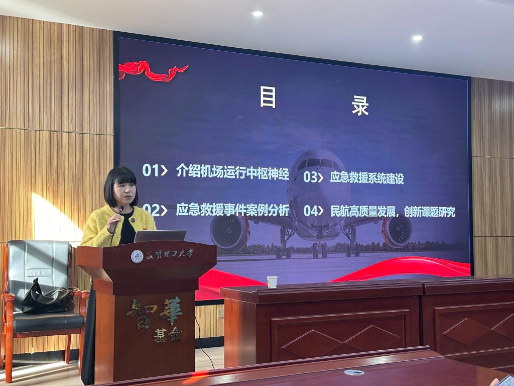 首先,魏老师详细介绍了机场运行中枢神经的重要性和作用,通过生动的比喻和实例,让复杂的机场运行体系变得易于理解。她强调,地面运行中枢作为机场的“大脑”,其高效运转是保障机场安全、有序运行的关键。紧接着,魏老师带来了应急救援事件案例分析。她选取了几个具有代表性的应急救援案例,深入剖析了事件发生的原因、处理过程及结果,并强调了应急救援在机场运行中的不可或缺性。通过案例的分享,同学们更加直观地感受到了地面运行中枢在应对突发事件时的关键作用。在第三部分,魏老师详细介绍了应急救援系统的建设。她指出,一个完善的应急救援系统不仅需要先进的硬件设施,更需要科学的管理制度和高效的团队协作。魏老师还分享了自己在应急救援系统建设中的经验和心得,为同学们提供了宝贵的实践指导。最后,魏老师将话题转向了民航高质量发展与创新课题研究。她结合当前民航业的发展趋势和云南各个机场的实际情况,探讨了民航高质量发展的路径和策略。同时,她还鼓励同学们积极投身于创新课题研究,为民航事业的发展贡献自己的力量。